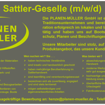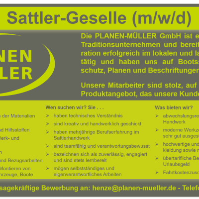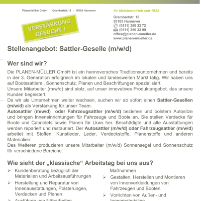 Die PLANEN-MÜLLER GmbH ist ein hannoversches Traditionsunternehmen und bereits in der 3. Generation erfolgreich im lokalen und landesweiten Markt tätig und hat sich auf Bootssattlerei, Sonnenschutz, Planen und Beschriftungen spezialisiert.